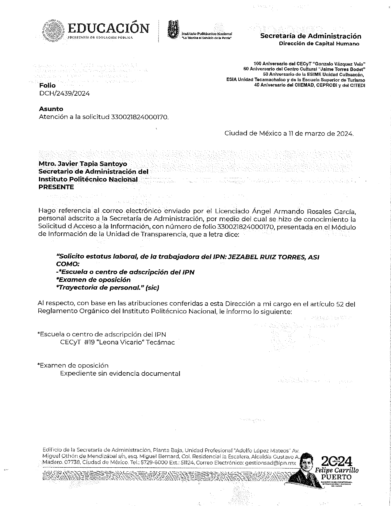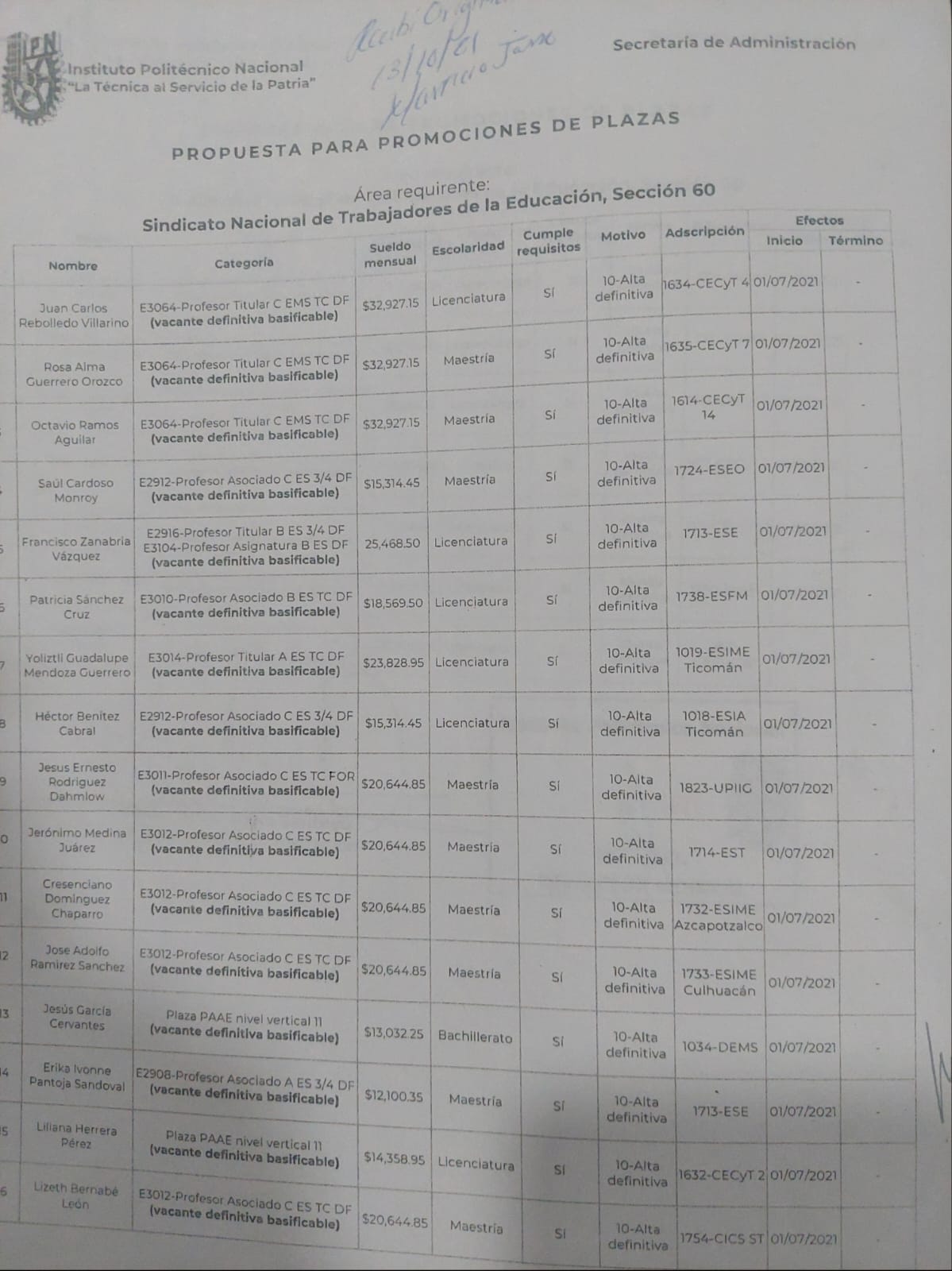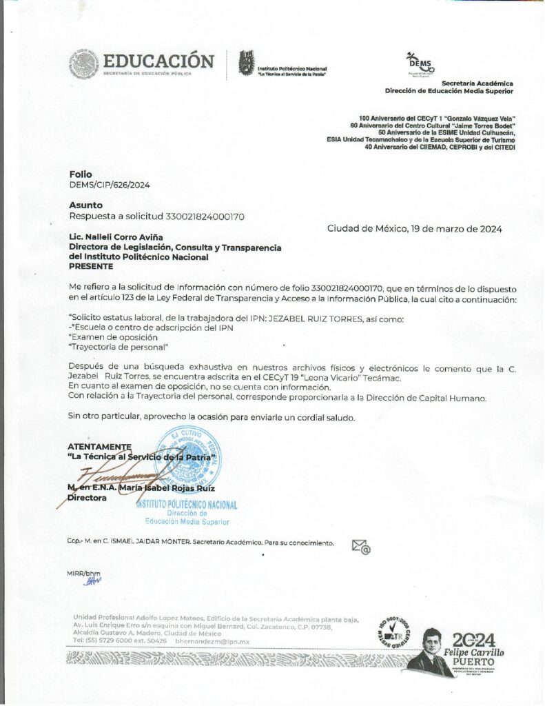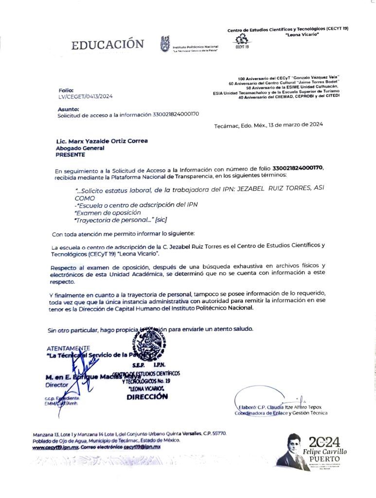 Jezabel Ruiz Torres, quien fungía como Asistente Ejecutivo “A” en la ESIME Zacatenco como parte del Personal de Apoyo y Asistencia a la Educación le fue otorgada una plaza de Titular “A” en el CECyT 19 “Leona Vicario”, ubicado en Tecámac.